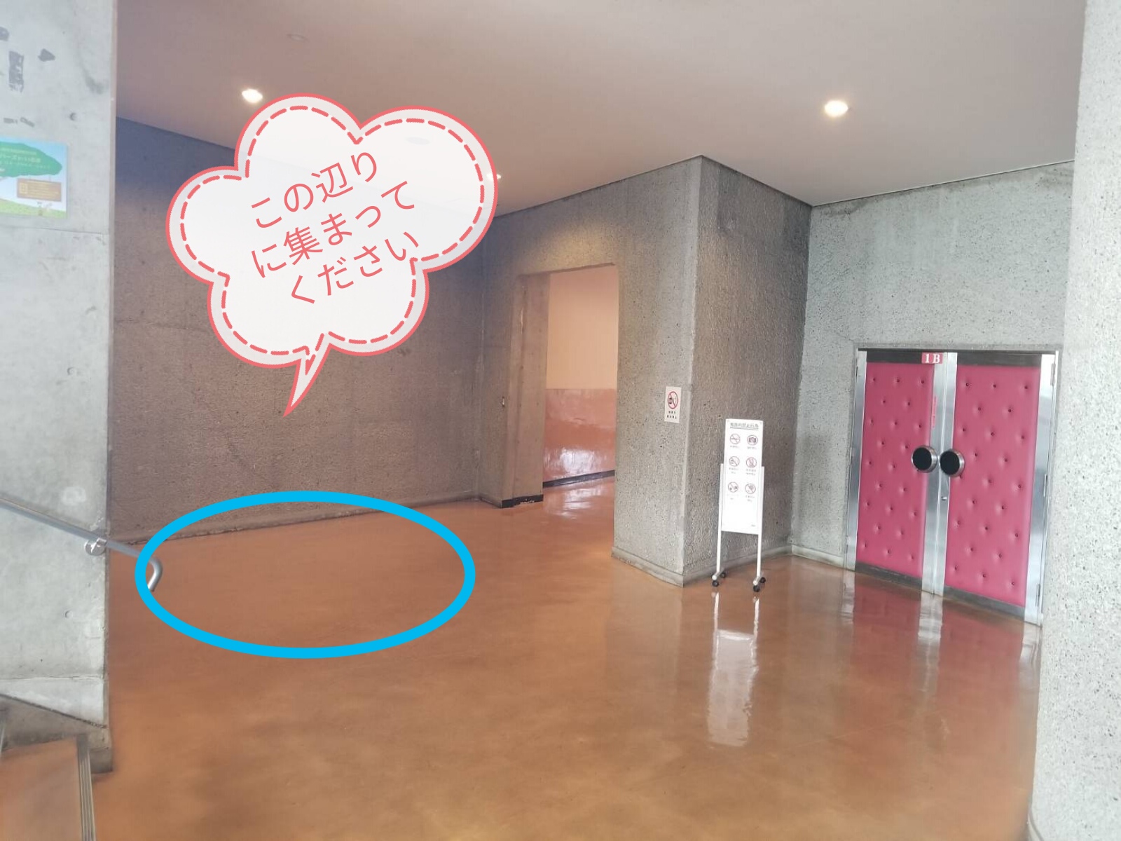 「1B扉」近くのスペースにお集まりください